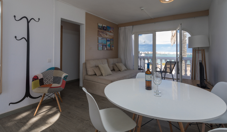 Este apartamento dispone de dos dormitorios independientes, además de un sofá cama en la sala de estar. Incluye cocina completamente equipada, baño con ducha, aire acondicionado y terraza o balcón amueblado con vistas al mar. Ideal para familias o grupos que buscan espacio y comodidad con vistas excepcionales. /p>