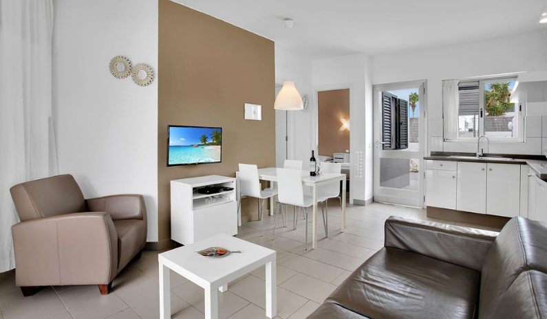 Apartamento con sala de estar y cocina conmpleta, y con dormitorio independiente y baño, que cuenta con terraza amueblada orientada hacia la piscina. Perfecto para disfrutar de un ambiente soleado y relajado.