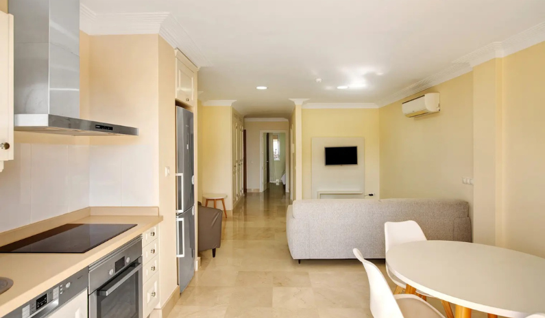 Este apartamento ofrece un espacio cómodo y funcional, con dormitorio independiente, baño privado con ducha, cocina equipada y salón con sofá y televisión de pantalla plana. El balcón está amueblado y tiene vistas al jardín, proporcionando un entorno tranquilo y acogedor.